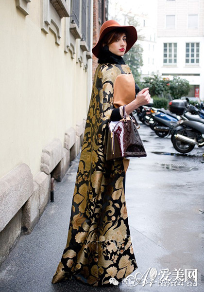 示范搭配:金色印花长款外套+短靴+宽檐帽+酒红色拎包
