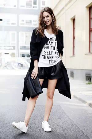 就算你的大腿小腿没那么粗壮,脚踝只要一粗,视觉上无论如何都逃脱不了“粗腿”的恶梦。这时“球鞋+短裤”就能成为你的黄金利器了,下摆稍宽的短裤可以减弱大腿的粗壮感~