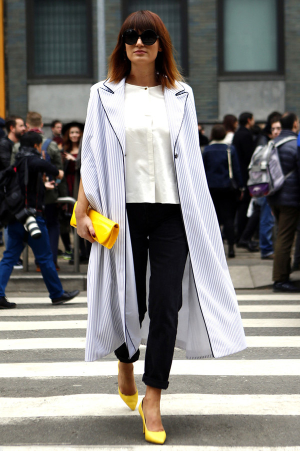 蓝白条纹的斗篷式风衣搭配白衬衫和牛仔裤看似风平浪静,可那耀眼的柠檬黄鞋包却可以毫不费力地掀起波澜。