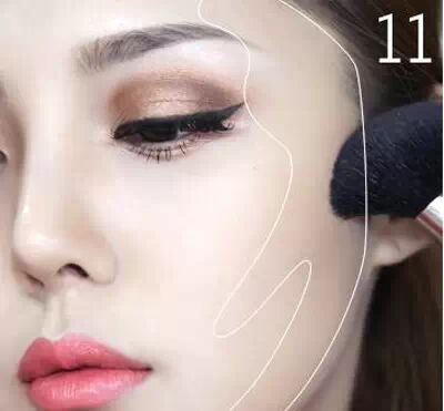 STEP11:在脸颊两侧的白色所示区域打上阴影。脸型看上去更精致立体和小巧。