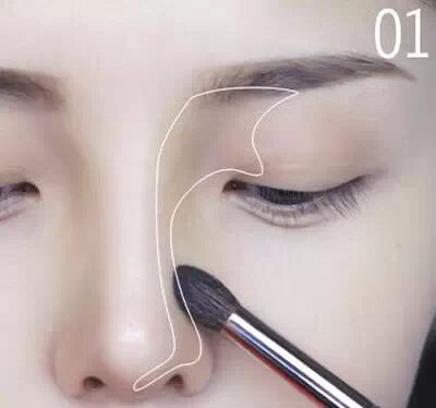 STEP1:粉底打底后修颜。沾取少量阴影粉在上图中白色细线区域内均匀涂抹开。