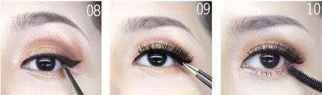 STEP8:蘸取眼线膏紧贴睫毛根部画眼线,在眼尾适当加长半厘米,并适当上扬。眼尾要有个三角区域,如果提拉上扬画不好,就用老办法,用小汤勺的柄辅助。