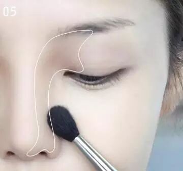 STEP5:小号的刷子蘸取适量的鼻影粉在图中白色范围内打造出自然的阴影,要和周围的肤色协调,不要颜色过深。