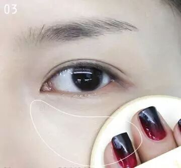 STEP3:将粘上遮瑕产品的粉扑在黑眼圈的位置轻轻按压,这样会比直接擦遮瑕产品更加服帖滋润。