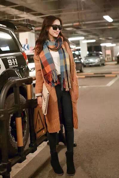 短靴配长裤又是截然不同的味道,白色T恤配黑色紧身裤,外搭橙色针织开衫,利用简约单品混搭出时尚干练的造型,气质全开,短靴的作用自然功不可没。