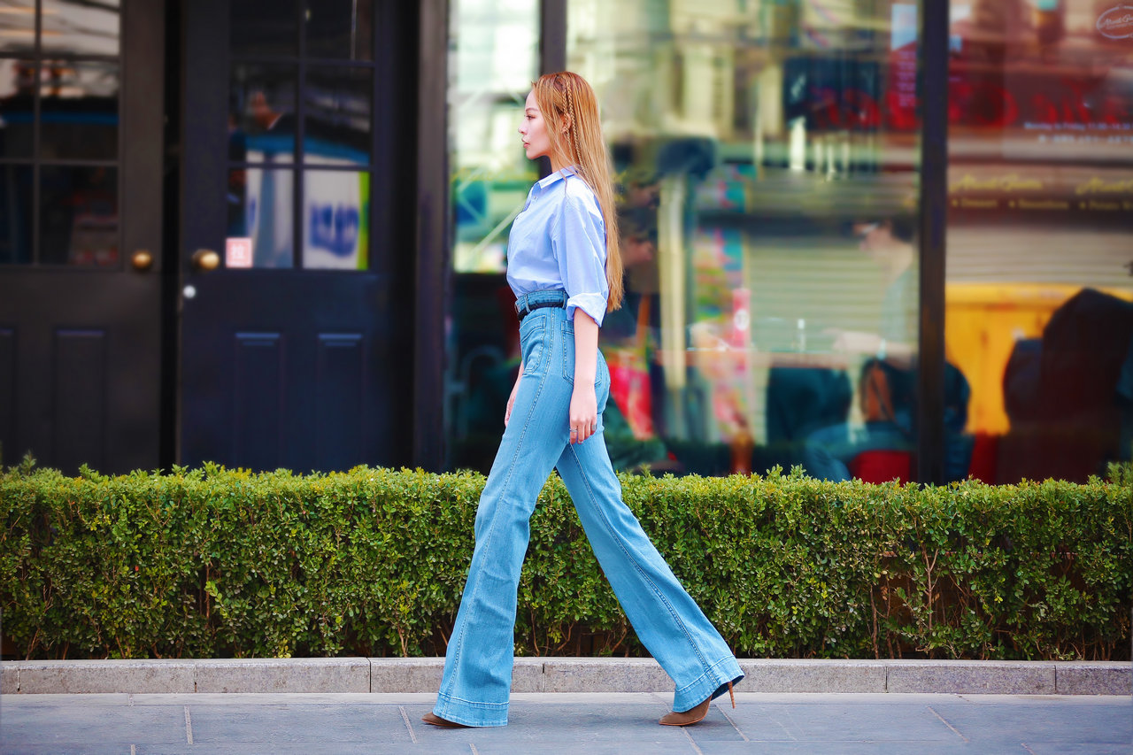 高腰阔腿裤搭配高跟鞋,大长腿分分钟GET!穿着时搭配同色系衬衫,将袖子略微挽起,越随意越范儿!