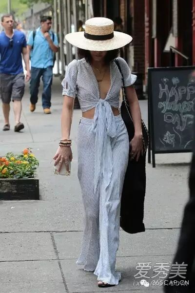 这位欧美潮人真的很会穿,露脐上衣搭配阔腿裤,加入竖条纹图案,既性感又不失优雅,身材显得玲珑有致,头上的遮阳帽很抢镜。