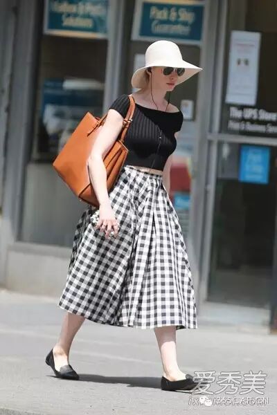 黑色一字肩上衣是短款露脐款式,小露香肩和蛮腰,勾勒优美身材曲线,搭配黑白灰色的格子长裙,穿出复古气息,戴上米色宽檐帽,更像一个复古名媛了。