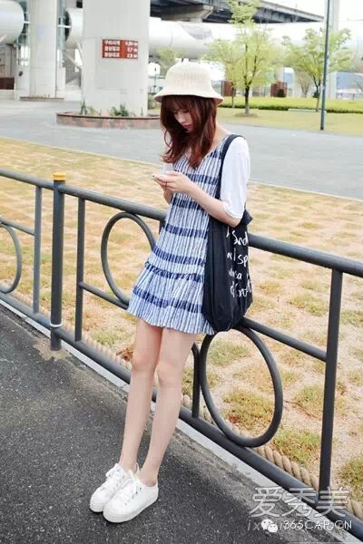 吊带款式的条纹连衣裙清新大方,搭配白色T恤,清纯恬静,脚踩白色球鞋,穿出文艺学生气息,配一顶古典的小圆帽,增添了几分俏皮和优雅。