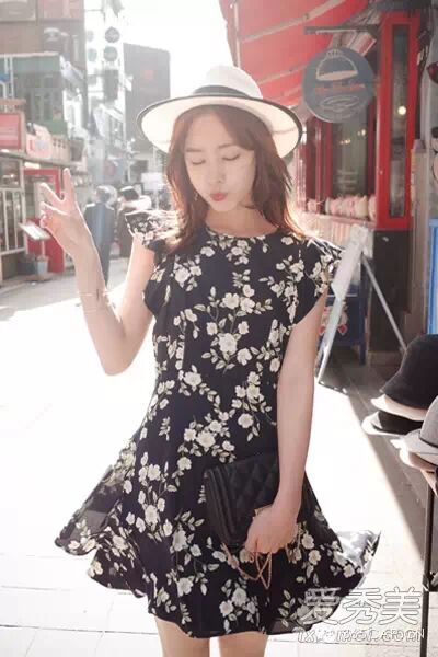 精致浪漫的碎花连衣裙,花边袖口显得格外精致,印花素雅清新,尽显夏日的明媚风情,搭配白色小礼帽,更显俏丽和时尚。