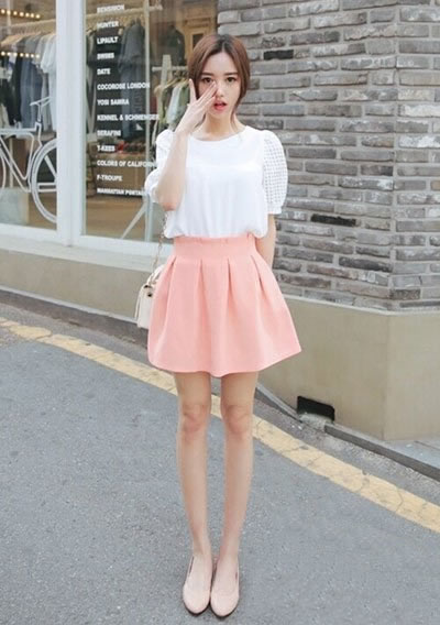 白色雪纺上衣搭配粉色百褶裙,简约纯净的上衣,泡泡袖设计,带来一丝公主范,这身搭配的色系就让人觉得柔柔的,即使下身的百褶裙稍短,但也恰好遮住了大腿,显得腿又瘦又长,是约会的好装扮哦。