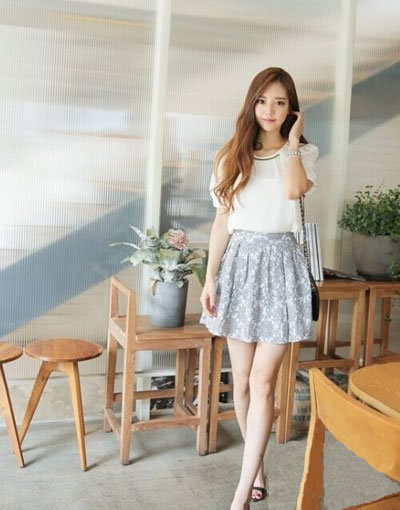 款式简单的雪纺衫就是清新飘逸的感觉,所以在百褶短裙的花色上也选择了浅色系,整个人便充满了文艺气息。