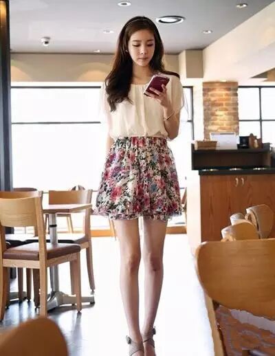 下身的印花百褶短裙休闲复古,加上雪纺衫的飘逸,整个人充满了清新文艺的气息。