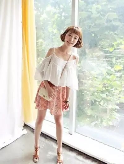 哪个女孩不爱裙装呢?以后看着别人穿着迷你小短前走过时再也不用心生羡慕了,因为你也可以拥有。白色的细带小露肩上衣因为领口大花边设计显得俏皮,再加上碎花百褶短裙,看起来更加活泼可爱。