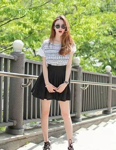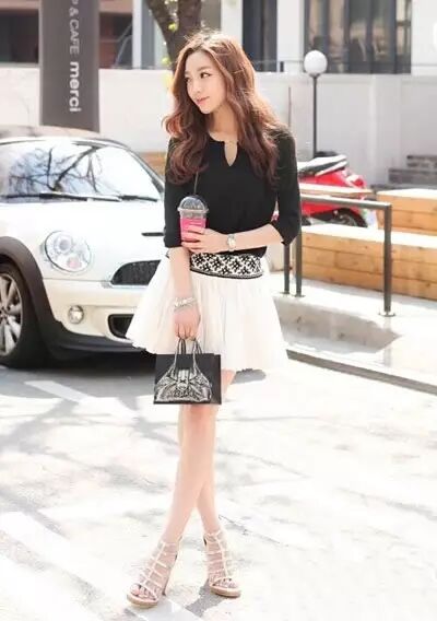 这款黑色上衣非常修身,所以将完美的身材展现出来,再加上下面白色的百褶短裙,经典的黑白搭配,适合OL一族。