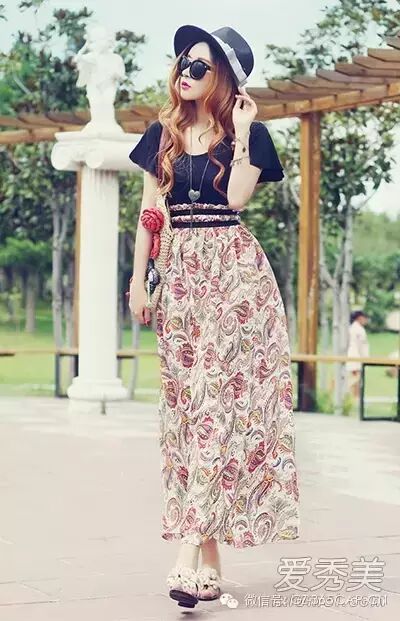 波西米亚风格长裙,花色有很多种,这种清新淡雅的印花元素,透着温柔雅致的气质,还有白色腰带装饰,更加精致时髦,搭配花朵装饰的帽子,浪漫唯美。