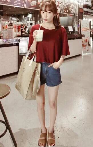 搭配TIPS:蓝牛+暗红宽松T+褐色单鞋+香槟色包包
