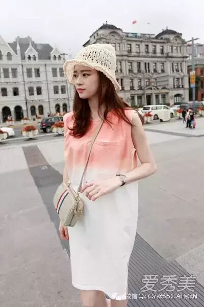 这款帽子清新可爱,颜色淡雅,和各种颜色的夏装都好搭配,造型可爱,显得格外少女,搭配渐变色的T恤连衣裙,休闲又甜美的风格,显得活泼娇俏。