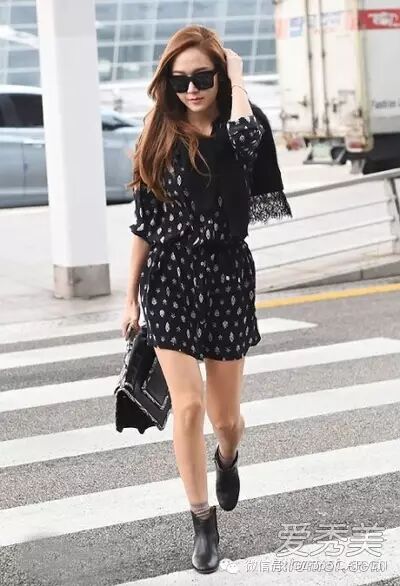 黑色印花连衣裙时尚性感,郑秀妍完全能hold住这种风格,戴上墨镜,星味十足,个子不高的女孩选择这种长度的连衣裙最能显腿长了。