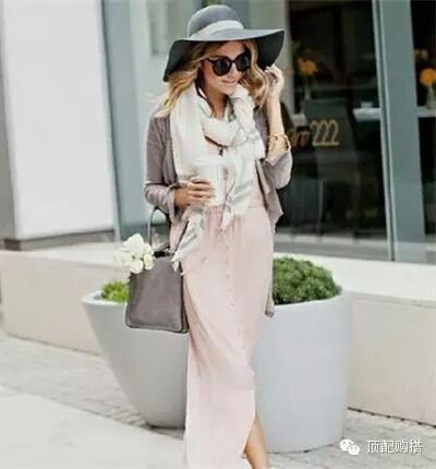 随性卷发和大宽檐的灰色帽子搭配出自然甜美风,将长刘海中分增添潮流感。