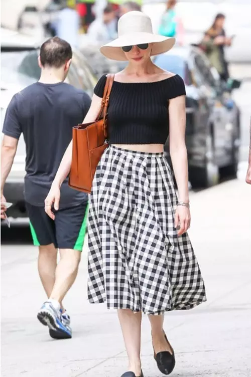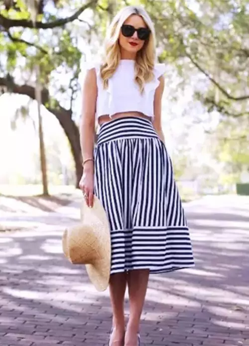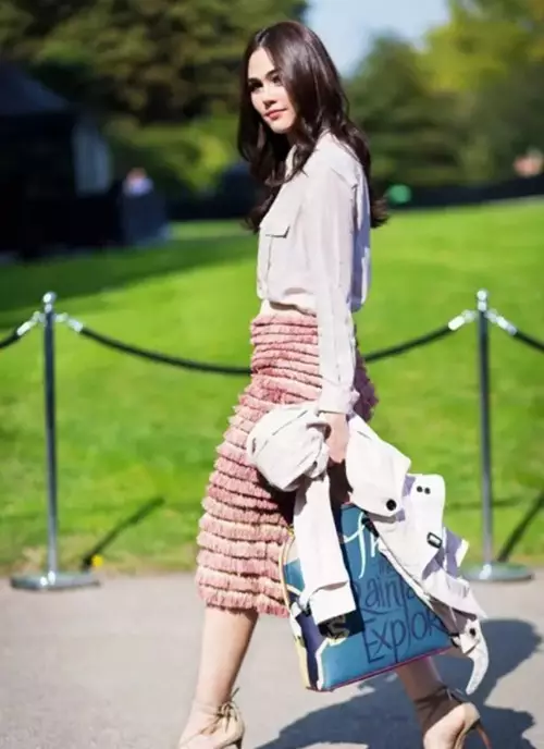 若是真的想穿,不妨将上衣置于裙子外面,适当遮住腰胯部。