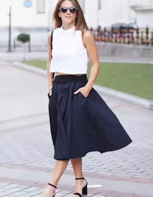 夏日穿大面积黑色未免过于沉闷,不妨选上一款深蓝色窄版伞裙,根据不同的身高酌情挑选裙长。