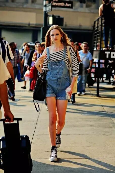 搭配露出一截腰腹的Crop-top,绝对是超模最热衷的背带搭法。最重要的是,平时不敢穿露腰款的你还能借机遮小腹哦!