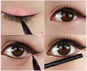 先贴假睫毛,再画眼线。上下眼线全部画上。上眼线紧贴着假睫毛根部画,填满内眼睑,再稍微拉长眼尾,有放大眼睛效果。下眼线沿着下睫毛根部画。