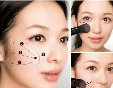 从颧骨的中心区开始,分3次按着箭头的方向,扫上腮红。腮红的范围上至眼角处,不要高过眼角,下与嘴角平行。