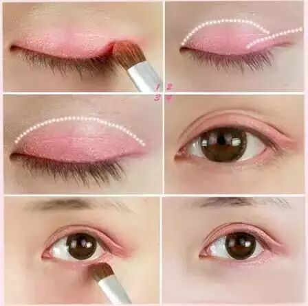 用粉色眼影扫过眼窝,眼尾颜色加重,然后再往上晕染过去,睁开眼睛正好在双眼皮的褶皱位置。继续用粉色眼影,扫过下眼睑的后半段,颜色不要太深,看起来有淡淡的色泽就ok了。