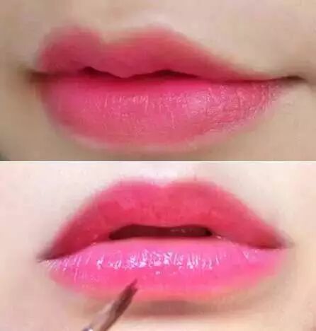 上唇妆前先用粉底液打底,遮住唇部原来的颜色;再均匀涂上粉色唇膏,最后涂一层唇彩,加强水润感。