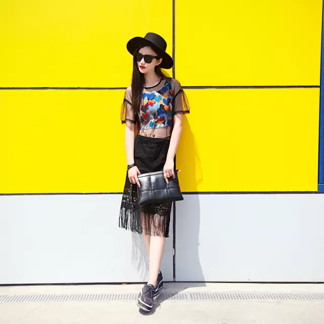 T台流行版型。顺滑手感不易皱。采用欧根纱拼接出透视效果,更显得整体的性感,瘦身的设计显身材特别的纤瘦。