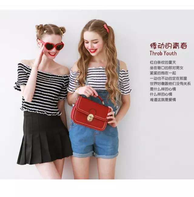 露肩的上衣穿淑女点就是只露到肩膀部位,但是更性感点的穿法就是更抹胸衣一样的效果,搭配条可爱的小短裙,非常的大胆还很俏皮的搭配。