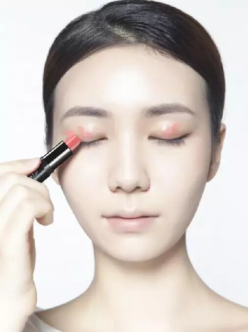 用口红在上眼睑眼球凸起处轻点三下。