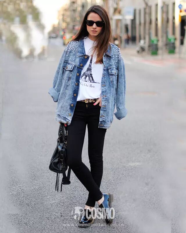 低调并性感的白T-Shirt搭配黑色牛仔裤,外搭一款豹纹腰带让你看起来绝对像个简约不简单的姑娘。外披牛仔外套相比明星们精致装扮,这身酷帅了很多并多了几分轻松简约,酷劲依然无法抵挡,举手投足间尽显“霸道女总裁”的气质。