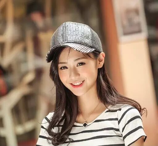 亮片和条纹都是流行元素,亮片街头休闲鸭舌帽搭配一件条纹短袖t恤,新潮又好看。