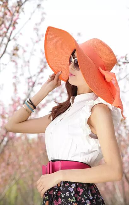 热情奔放的桔红色大沿草帽,搭配装的浅色系气质无袖连衣裙,这搭配显得格外清爽宜人。