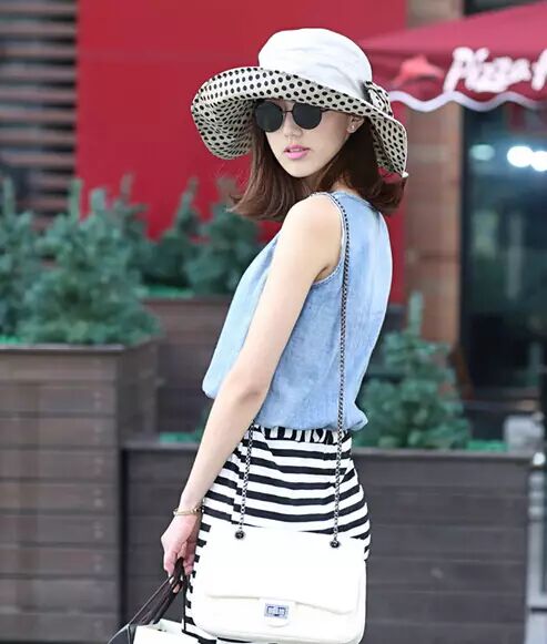 时尚波点大沿折叠太阳帽,蝴蝶结增添俏皮可爱,搭配一条背心下身条纹连衣裙,不仅防晒还很美观显得很有气质。