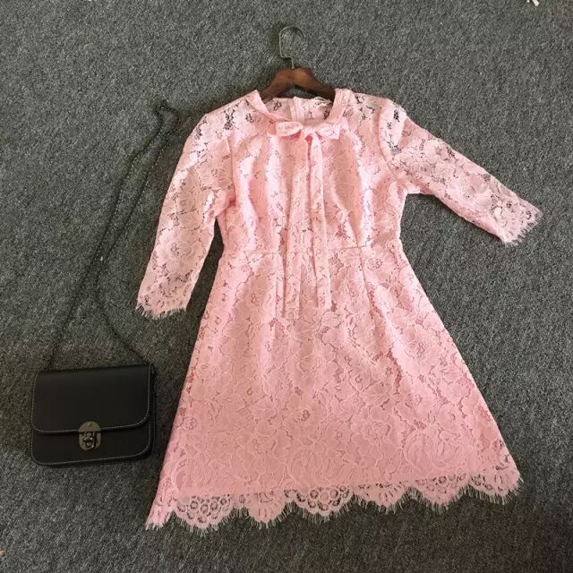 这款的上半身领子部分的蝴蝶结系带设计是今年秋冬的流行趋势之一,这个设计点不仅增加了甜美感,也让蕾丝裙更少女气质~