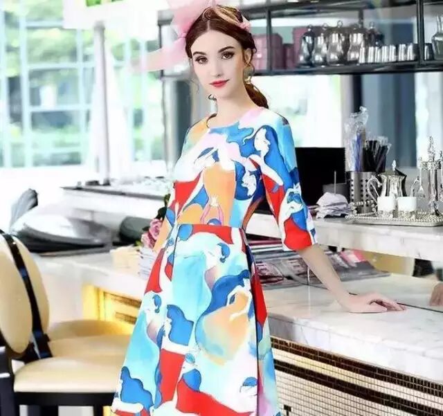 复古的印花裙,上身很漂亮,立体的细节,摩登的色彩,时尚度满分!