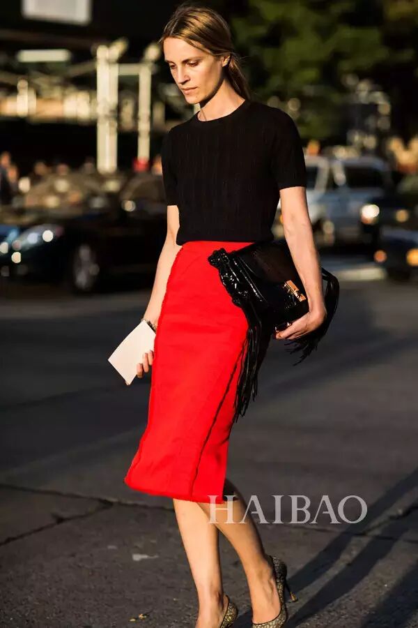 红色套装优雅大气,过膝筒裙搭配黑色上衣凸显身材优势,还有什么能比它们更加优雅抢镜么?