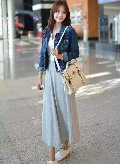 谁说秋季不能穿自己喜欢的裙子,穿上长裙搭配牛仔外套一样美的冒泡,尤其是休闲款的棉质长裙,舒适又保暖,干净利落而简约,给人第一印象就很温婉,搭配牛仔外套来穿着可以将你的身线完美的勾勒出来。