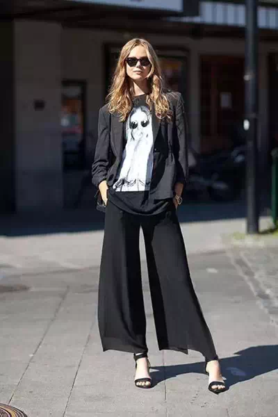 比起慢跑裤来说,阔腿裤可能更好搭配一些,还能有效遮大粗腿。远远看上去像条长裙