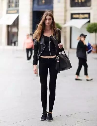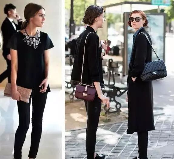 微胖的姑娘应该经常会选择这样All Black的穿法,因为最显瘦嘛!不过一身黑难免会让人觉得比较单调,建议可以适当的露出肌肤,或是选择裸色鞋子、亮色包包或一些闪亮的配饰作为整体搭配的点睛。