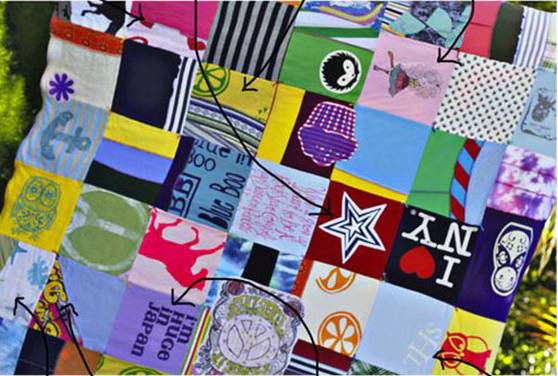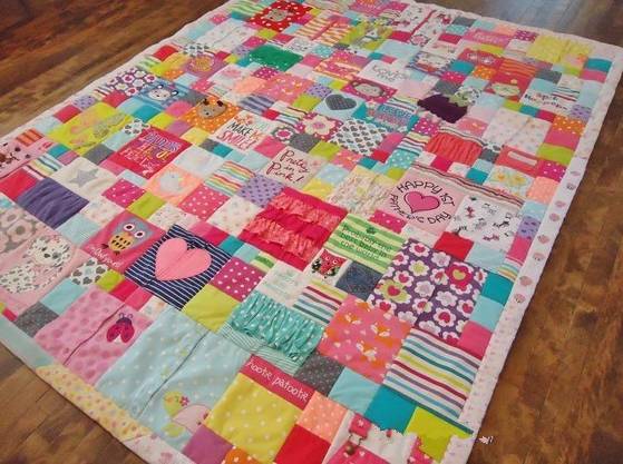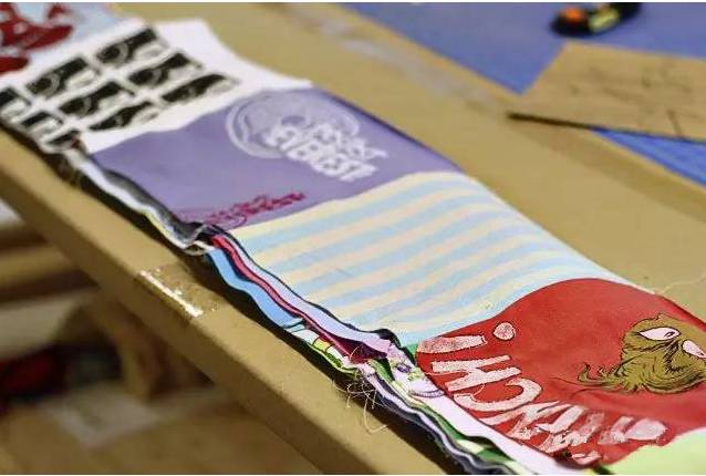 接下来正式进入这种需要搭配色彩的拼布啦,只需要将所有的旧衣服,按你预想的大小来进行裁剪,进行缝制。