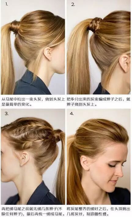 步骤2:将发辫混入其他头发,将全部的头发简单的高高扎起成马尾。