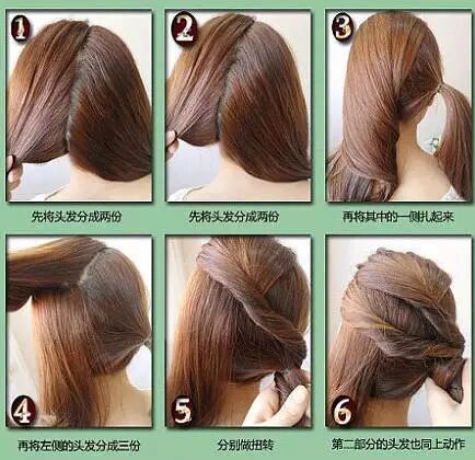 步骤1:将头发分两半,右边的头发用橡皮筋半扎好,左边的头发分三股,分别扭转。