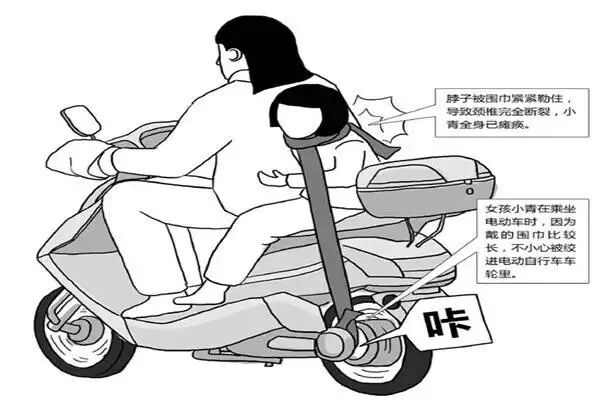 佩戴围巾不宜过长,不要打死结,最好把围巾的两端塞进衣服里或进行固定,特别是乘坐自动扶梯或坐着自行车、电动车后座时,要将围巾腋到衣服内。一旦发生围巾绞缠引起窒息,旁人要首先划破围巾,解除患者脖子上的束缚,同时拨打急救电话。领取艺术签名加:mwenba