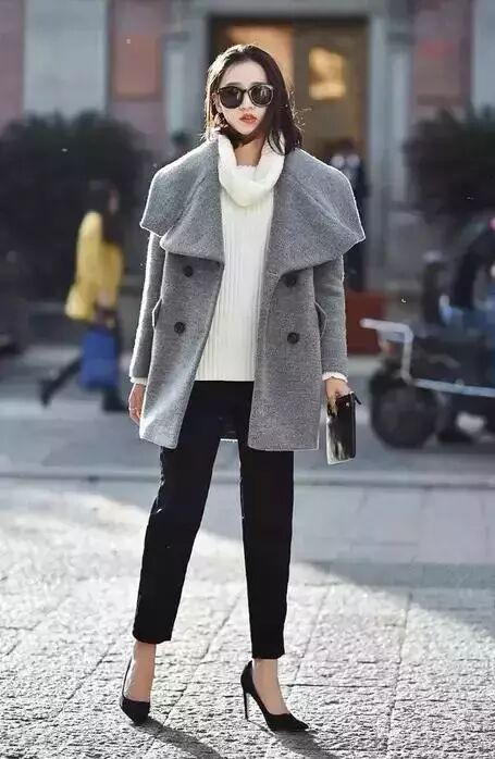灰色翻领毛呢外套+白色高领毛衣+黑色九分休闲裤+黑色尖头高跟鞋+黑色信封手拿包