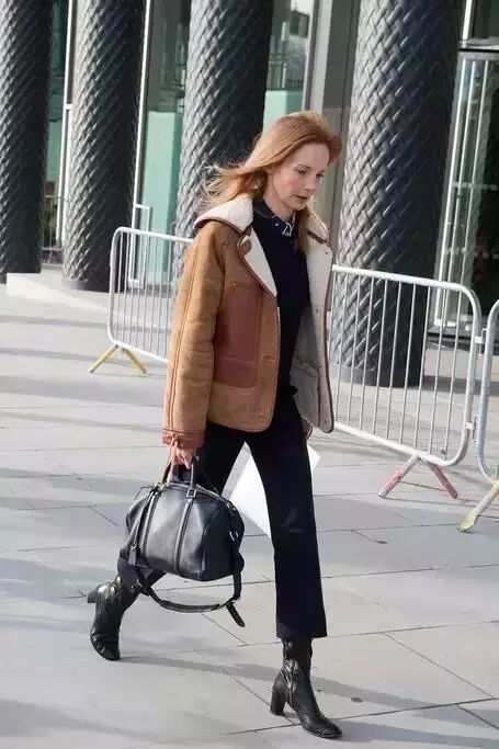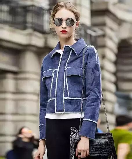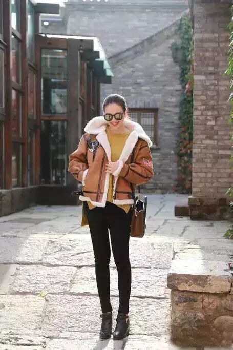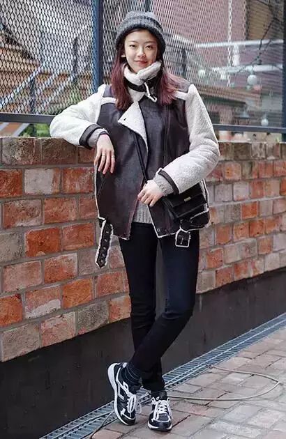 今年大热的麂皮夹克配上黑色裤子,帅气利落,多了几分街头朋克感。车缝线外露羊羔毛,给人既保暖又多了几分优雅时尚的视觉效果~
